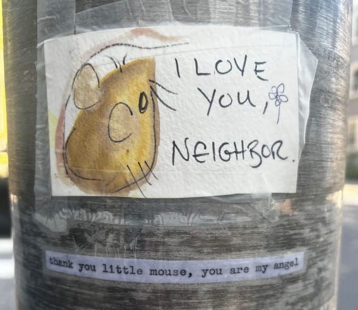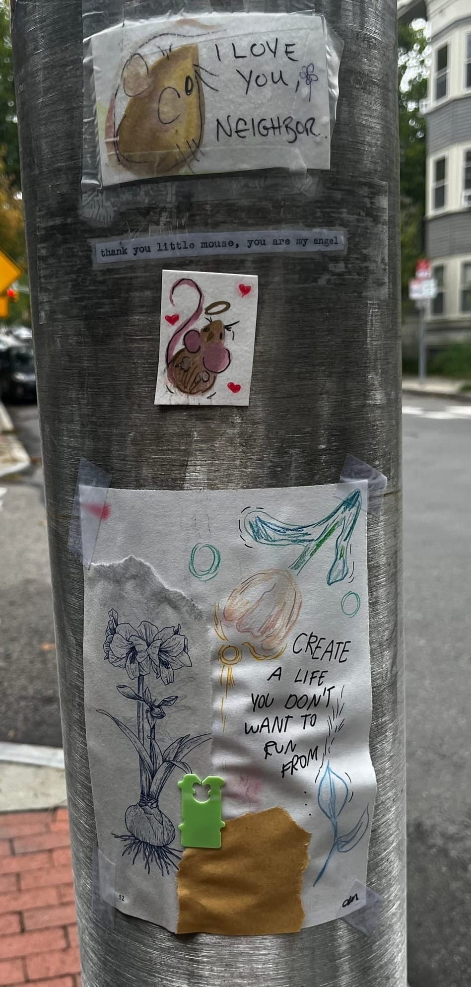 Last spring, while I was walking to the store one early afternoon, I saw a woman seemingly taking down a mouse tacked to a pole. I approached her on the sidewalk and asked her what she was looking at. Playing "dumb" to get a live critique.