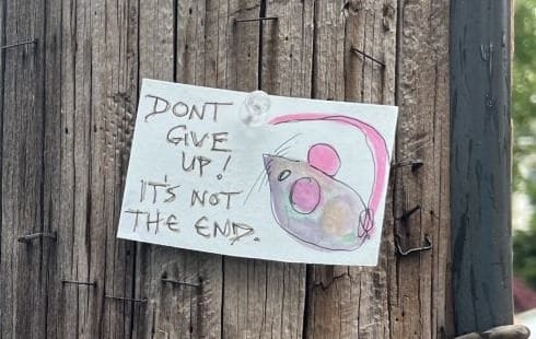 I created tiny paintings with little minimalist watercolor mice, wrote inspirational quotes on them and pinned and taped the paintings around town. The paintings are very small, the largest: the size of a postcard, the smallest: less than an inch in width.